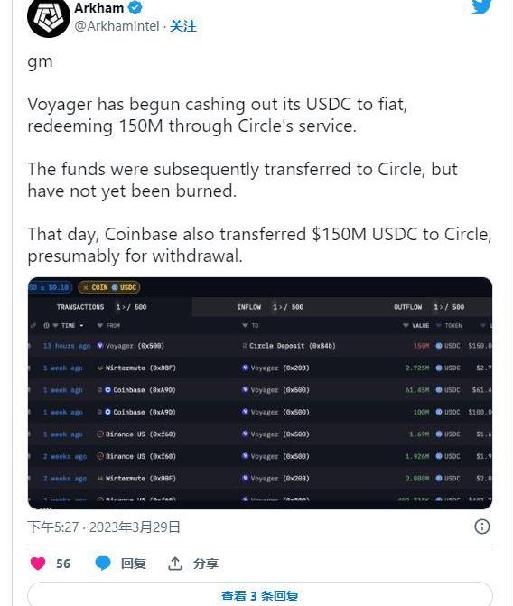 據ArkhamIntel稱,Coinbase向Circle轉移了1.5億美元的USDC,而Voyager已開始使用Circle的服務贖回1.5億美元,將其USDC資產轉換為法定貨幣。