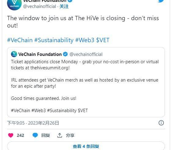 在大流行導致的三年中斷之后,VeChain以其新活動HiVe回歸。HiVe活動的目標是促進與Web3社區成員的協作。它還力求迎合所有以可持續發展為重點的發展。HiVe活動的所有門票申請將于2月27日星期一截止。因此,所有有意參加活動的愛好者請盡早預訂門票。