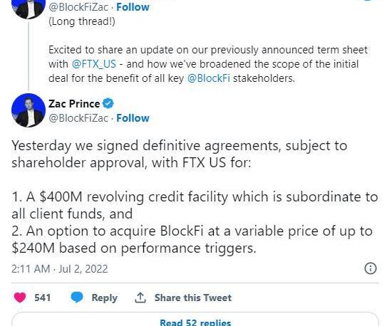 “與FTX達成的這項信貸便利協議為BlockFi提供了獲得資金的途徑,這進一步增強了我們的資產負債表和平臺實力,”BlockFi發推文說。