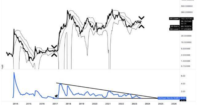 此外,布林帶寬度整整六年來一直在向較低的高點收縮。如果下降趨勢模式被打破,五年來最大的波動可能會到來。