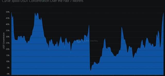 在美聯儲停止加息的消息引發的近期加密貨幣市場崩盤之后,去中心化金融(DeFi)用戶出現了令人驚訝的趨勢。來自Curve的數據顯示,在3pool中,資金從USDT到其他穩定幣的轉換發生了顯著轉變。3pool由USDT、USDC和DAI組成,是Curve上最大的穩定幣礦池。在過去的48小時內,池中的USDT比率出現了明顯的失衡,從最初的30%上升到驚人的51%。與此同時,3pool中的USDC和DAI利率分別降至24.5%和25.2%。