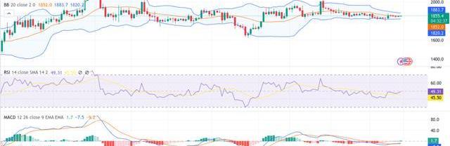 以太坊(ETH)也出現了溫和的牛市活動,截至發稿時,該資產在交易日內上漲了0.4%,達到$1855,而交易量下降了6%,達到$2.2B。隨著布林帶保持相對較近的距離,ETH的波動水平也在緩慢下降。