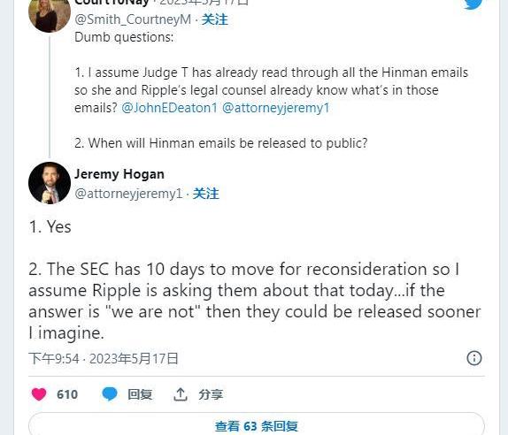 Hogan&Hogan律師事務所的合伙人JeremyHogan強調,SEC有大約10天的時間針對這一特定命令提交上訴。此外,包括AshleyPROSPER1在內的XRP社區成員推測,文件被啟封的可能性可能會促使雙方考慮達成和解,因為他們可能擁有他們希望避免公眾監督的信息。