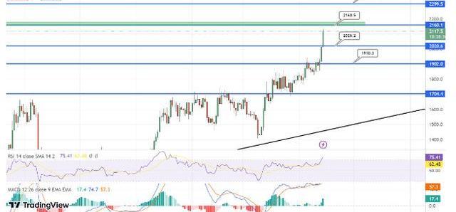 以太坊是第二大最受歡迎的加密貨幣,正在經歷明顯的看漲趨勢,已突破2,075美元的阻力位。該加密貨幣目前正走向2,150美元,這是由2022年5月的前一個高點確立的阻力位。
