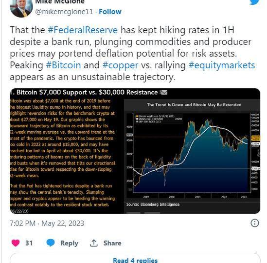 在發表報告前幾天,McClone曾在推特上表示,即使今年發生了銀行擠兌的危機,但聯準會仍持續升息,并認為比特幣本輪上漲行情的頂部阻力就是3萬美元。