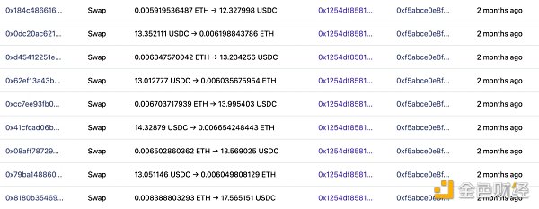 獵人 1 的首次 transaction 發生在 2021-11-01 ,他從另一個地址轉入了一筆款項。值得注意的是,他后來的兩筆 Swap 交易間隔僅 15 秒。他首先將 ETH 交換為 USDT,然后又將 USDT 交換回 ETH。這種快速連續的交易行為,看起來像是在刷提高活躍度。