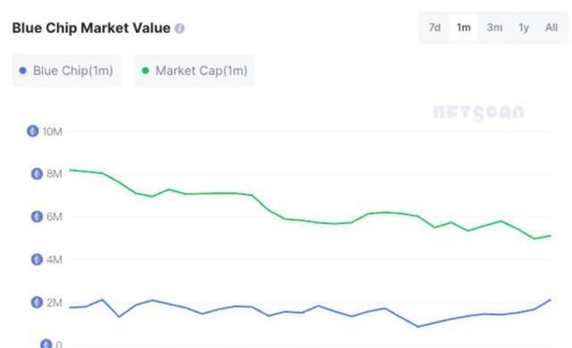 NFTScan數據顯示,19個藍籌合約的市值為2128,268ETH,占NFT總市值的41.68%。