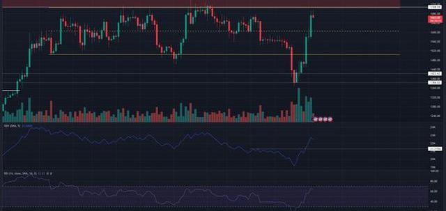 這看到以太坊突破了1500美元和1600美元的水平,在1600美元區域暫停了幾個小時。這似乎是中檔標記。在北部,1700-1750美元區域可能對價格構成阻力。