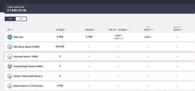 Aave緊跟MakerDAO其后于2021年宣布上線RWA市場,同樣允許真實資產的抵押借貸。和MakerDAO一樣,Aave采用了Centrifuge作為RWA提供商,其RWA市場使Aave儲戶能夠針對真實世界抵押品賺取收益,同時Centrifuge資產發起人可以從Aave借入資金。目前AaveRWA市場規模在763.5萬美元左右,且只有一個USDC市場還能提供存借APY,其他市場都已經不再提供。