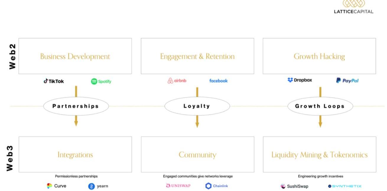 萊迪思資本對目前已被證實的Web3公司可以開始制定其收購戰略的方式做了一個很好的細分?——合作伙伴關系、用戶所有權和代幣驅動的增長池是Web3增長戰略的支柱。