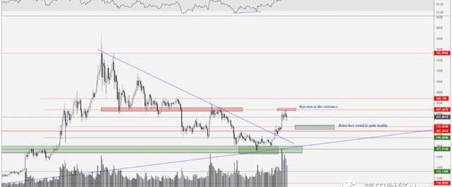 4小時K線顯示,從9200美元處的大幅回落,主要是因為比特幣在突破9000美元時顯得較為弱勢而造成的,這也導致了RSI出現了看跌的分歧。通常情況下,突破都會導致放量,除非是假突破。