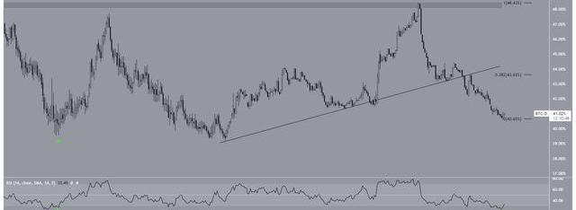 如果發生這種情況,最近的阻力區域將在43.50%,由之前的上升支撐線和0.382Fib回撤阻力位創建。