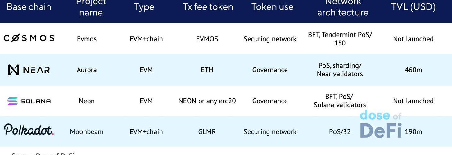 具體來說,Polkadot已經添加了Moonbeam、Near推出Aurora,并且很快,Evmos將在Cosmos上線和Neon將在Solana上線。?