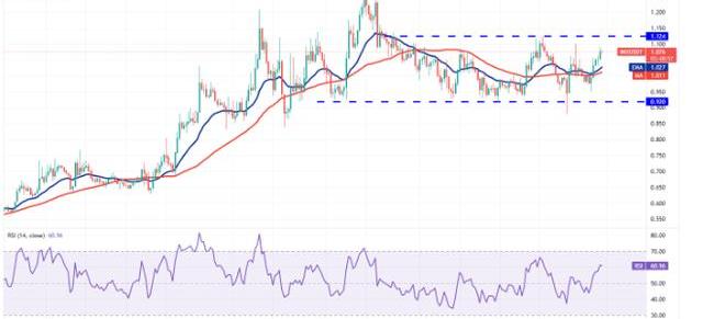 IMX/USDT貨幣對可能升至1.12美元,空頭將再次試圖阻止復蘇。如果買家推土機通過,該貨幣對可能會加速升向上方阻力位1.30美元。這是一個需要密切關注的關鍵水平,因為突破并收于該水平上方可能預示著新的上升趨勢的開始。然后該貨幣對可能飆升至1.85美元。