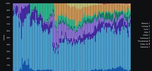 Uniswap利用這種興趣并獲得了67%的DEX市場份額。但是,隨著Uniswap失去其v3許可證,Uniswap的這種主導地位可能會受到威脅。