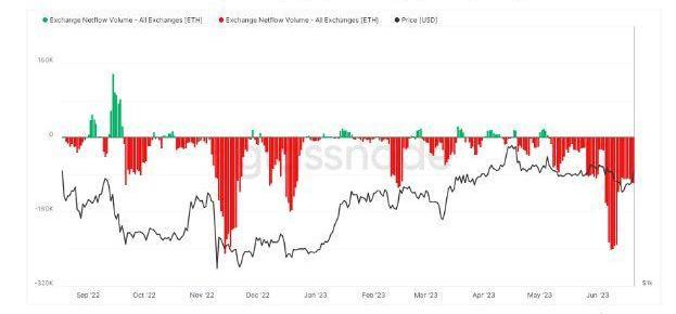 交易所充提現凈流量顯示,6月初,在幣安和Coinbase監管壓力下,提現量大幅增加。