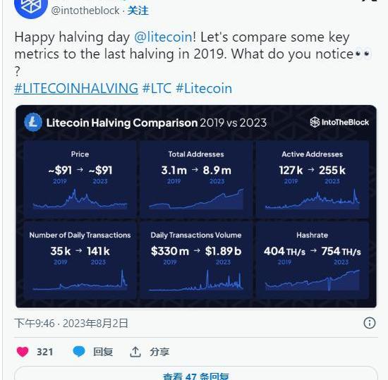 區塊鏈研究員IntoTheBlock在昨天的帖子中透露了有關萊特幣的指標。比較2019年和2023年,研究人員發現網絡參與度大幅增加,而價格保持穩定。