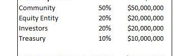 同時,我們假設代幣結構表的分配比例類似下表,其中投資者擁有20%的分配比例。要記住,這分配給團隊的20%代幣分配給了股權實體,而非創始人和員工。
