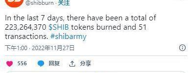 “在過去的7天里,總共銷毀了223,264,370個$SHIB代幣和51筆交易。”