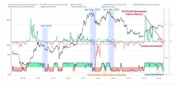 Glassnode指出,上周的價格下跌“值得密切關注”,并發現BTC短期持有者的損失勢頭和主導地位已經激增。當這種情況發生在2021年5月和12月時,隨后BTC的價值出現了“更劇烈的下跌趨勢”。