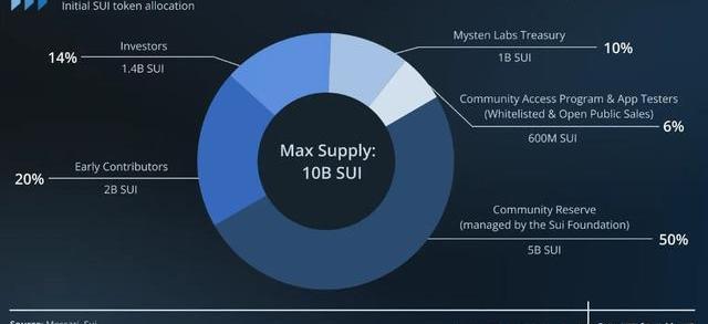 Sui基金會宣布最多只能提供100億個代幣。社區儲備將獲得50%的代幣。同時,早期貢獻者和投資者將分別獲得20%和14%的代幣。