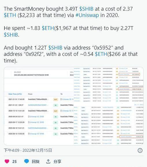 SmartMoney在2020年通過#Uniswap以2.37美元ETH的價格購買了3.49T$SHIB。他/她花費了約1.83美元ETH購買了2.27T$SHIB并購買了1.22T$SHIB通過地址“0x5952”和地址“0x92f2”,成本約為0.54$ETH。
