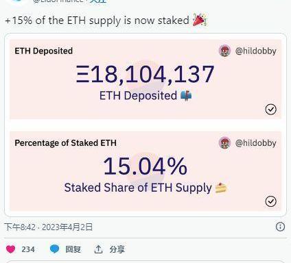 隨著上海升級的臨近,對以太坊質押的興趣持續增加。根據Lido4月2日的一條推文,所有以太坊供應量的15%都被抵押了。
