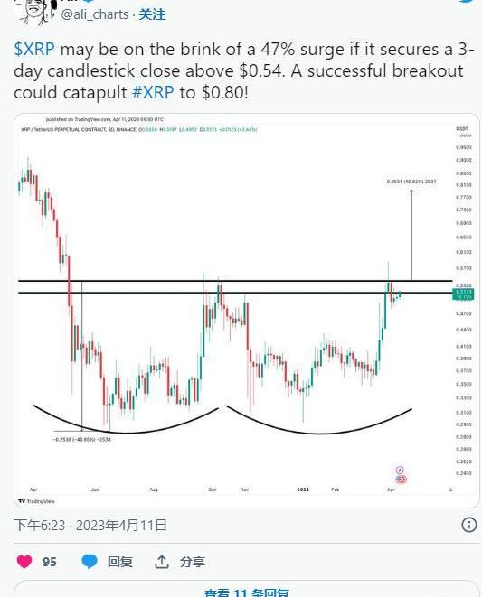 領先的加密貨幣分析師AliCharts預測XRP的價格可能很快就會突破。這位分析師分享了一張圖表,表明如果3天燭臺收于0.54美元上方,XRP可能會進一步上漲。