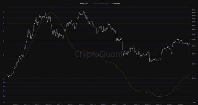圖表中描繪的長期持有者SOPR指標以及100天移動平均線表示長期持有者實現的利潤或損失的比率。數值高于1表示獲利了結,數值低于1表示虧損。