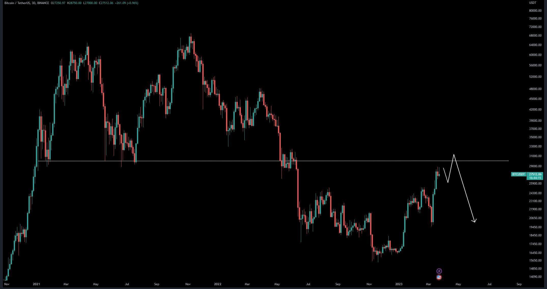 他在推特上寫道:“請將下跌的成交量再推高至30,000美元”一張預測圖表。
