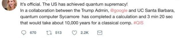 “官宣。美國實現了量子霸權!”美國總統的女兒、高級顧問伊萬卡?特朗普在他的Instagram上寫道。由此可見一斑。