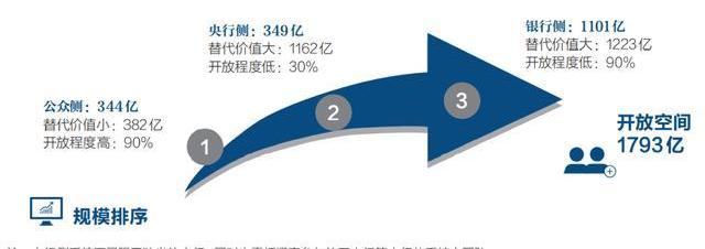 公眾側系統替代價值為382億元/年,整體空間略小,但預計開放規模可觀;支付軟硬件的市場化程度相對偏高;數字錢包的存儲技術已經相對成熟,應用模式創新將成焦點,估算公眾側系統針對社會企業的開放率為90%,則對應市場空間為344億元/年。