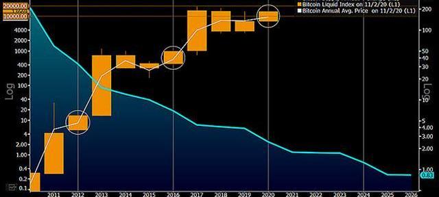 他寫道:“如果以前的模式再次發揮作用,那么2021年,比特幣可能會像2013年和2017年那樣呈拋物線式上漲。”