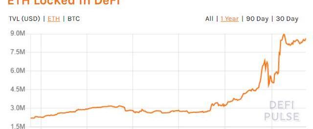 據DeFiPulse的數據顯示,自6月以來,鎖定在DeFi協議中的以太坊數量增加了218.5%,從270萬枚增長到了860萬枚。鎖定的比特幣數量已經從年中的5,000枚增長到今天的約158,800枚,增長了3,000%以上。