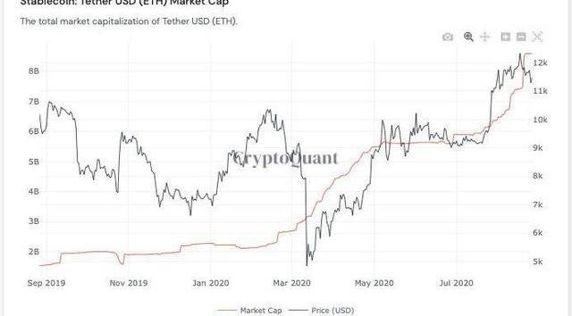 “為了彌補隨著比特幣價格上漲而產生的購買力不足,新的法幣需要流入市場,也就是說需要增加穩定幣的供應量。”