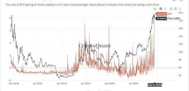 比特幣礦工頭寸指數來源:CryptoQuant根據CryptoQuant的數據,12月10日,兩筆與礦工相關的大額比特幣交易被發現,當時礦工頭寸指數突然飆升至2017年以來從未見過的水平。