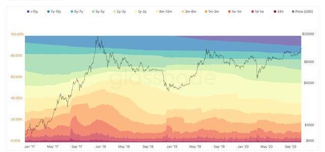 我們還可以觀察到“囤幣”模式的增加——在一段時間內一直沒有改變過地址的比特幣供應百分比。62%的供應量至少在一年內沒有改變過地址,而近三分之一的供應量在三年或更長時間內未改變過地址。