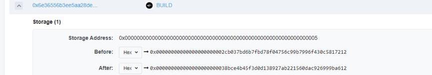 通過查找內部的Storage可見權限轉移給了0x38bce4b45f3d0d138927ab221560dac926999ba6地址而不是上述的0xdcc8A38A攻擊地址。交易哈希為:0xe3525247cea81ae98098817bc6bf6f6a16842b68544f1430926a363e790d33f2。