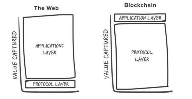 而區塊鏈時代價值將集中在共享協議層,只有小部分價值分布在應用層。由此誕生了「胖」協議和「瘦」應用。