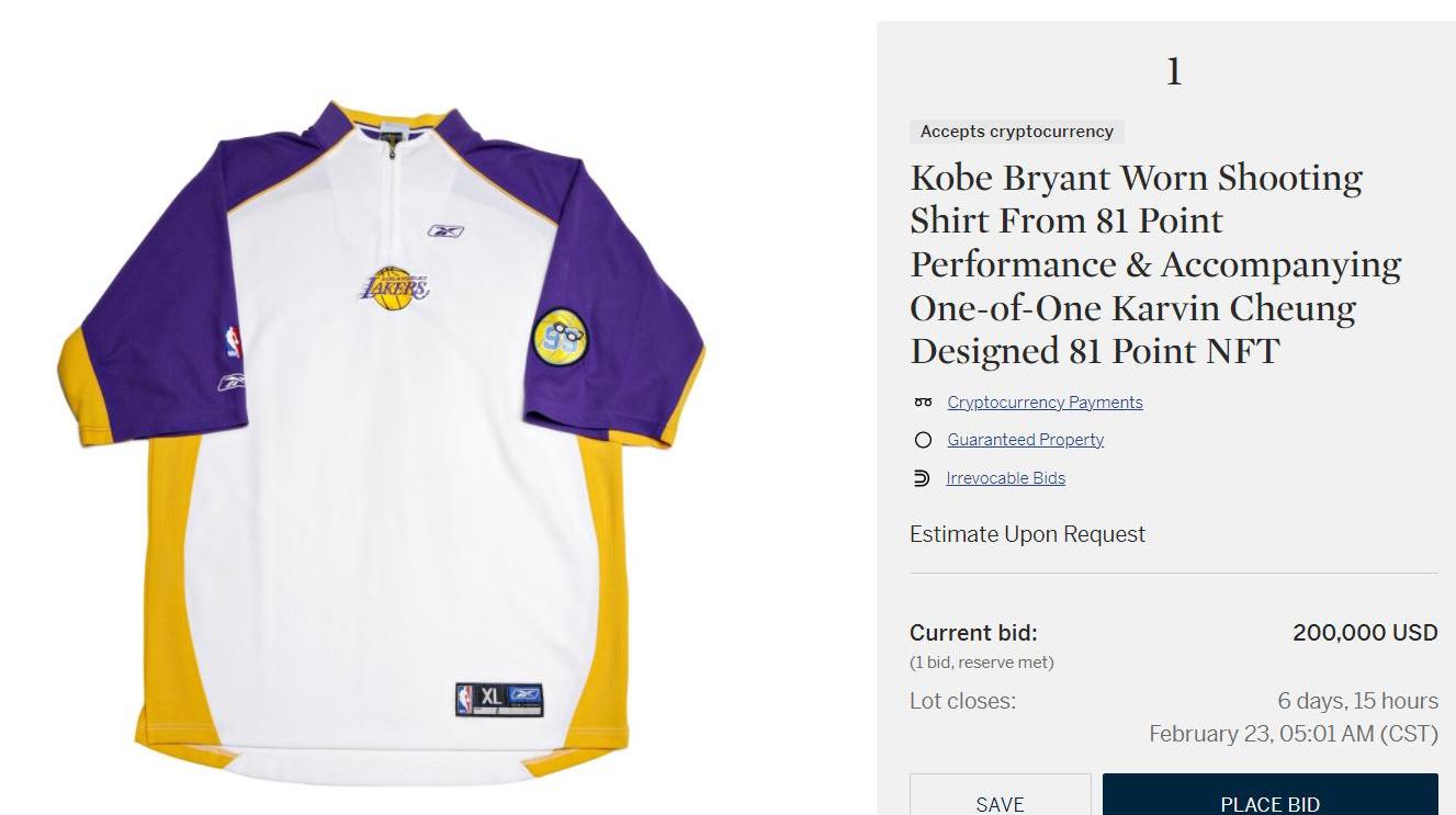 科比的投籃球衣將以實物形式出售,同時還配有科比81分比賽的NFT動畫。這件球衣的起價為20萬美元。蘇富比將接受ETH、BTC、USDC以及法幣的最終支付。