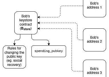 如果用戶在許多L2上有許多地址,包括所在的L2不知道的地址,那么似乎只有一種方式可以讓用戶更改他們的密鑰:資產/密鑰庫分離架構。每個用戶都有一個“密鑰庫合約”,用于存儲所有錢包的驗證密鑰以及更改密鑰的規則,和L1和許多L2上的“錢包合約”,用于進行跨鏈讀取以獲取驗證密鑰。