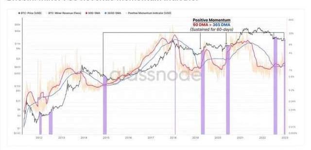 網絡需求增長的另一個跡象是來自礦工收入費用的健康增長。這是區塊變得擁擠和費用上升的結果。當90D-SMA礦工收入超過365D-SMA,這標志著區塊空間更加擁堵,收費壓力正在加大。