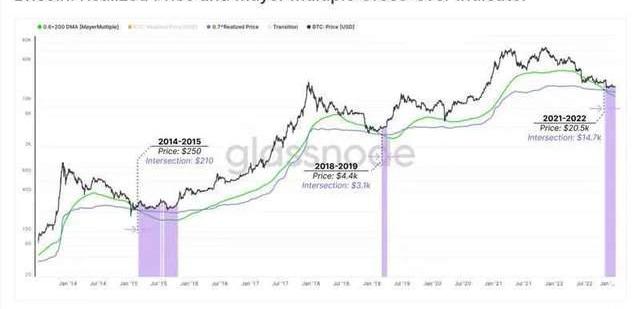 第一個觀察結果是,持有比特幣至少6個月的投資者群體通常在實現上限后期熊市中持有量變成60%-80%。因此,我們將選擇70%,并將其作為實際市值的砝碼。這是對最低估值的一種衡量,它代表了擁有「最堅定控制力」的投資者。在所有交易日中,現貨價格收于這一水平以下的天數不到1.6%。