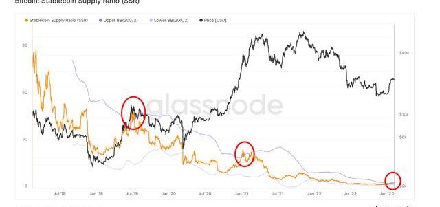 當SSR較低時,當前的穩定幣供應有更多的“購買力”來購買BTC。它充當BTC和美元之間供需機制的代理。