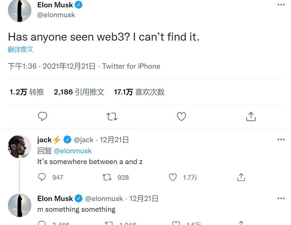 Musk在推文里表示,「有人看到Web3.0嗎?我找不到它。」Dorsey幽默的給出了回復,「它在a和z之間。」