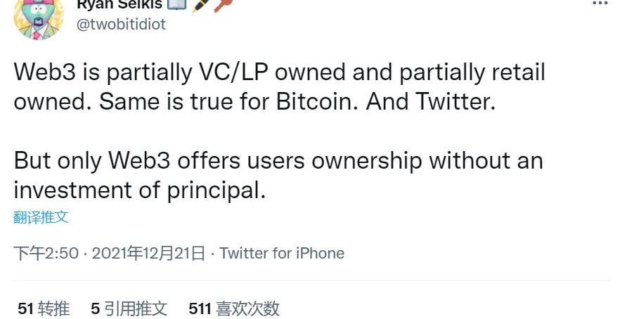Messari的首席執行官RyanSelkis也持有類似的觀點,他寫道:「Web3.0部分由VC/LP擁有,部分由其他人擁有。」