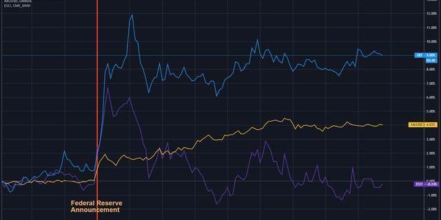 根據上方來自TradingView.com的圖表,在美聯儲發布聲明之后,比特幣回彈了9.5%,黃金也上漲了4%,然而標普500指數期貨—反應了大多數美股證券價值—已經下跌了0.25%。