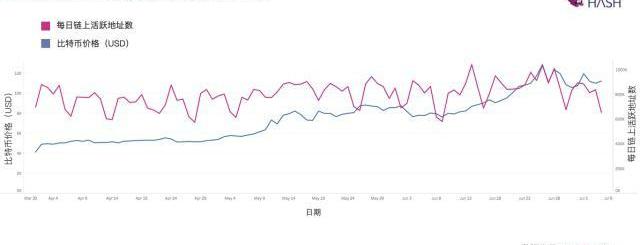 4月1日比特幣仍在4000美金處盤整的時候,比特幣網絡日活地址數為69.8萬。6月比特幣價格達到13800美金高點,此時日活躍地址數為104萬,大致與價格漲幅一致。