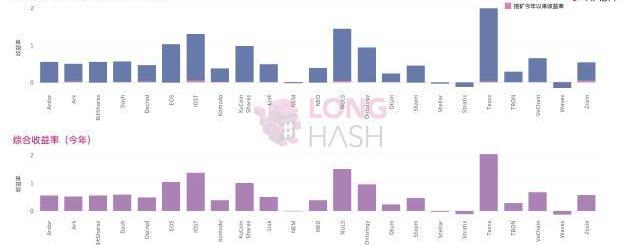 根據Messari數據,LongHash選取市值靠前的24種PoS代幣,分別統計了近一年和2019年以來截止到4月26日這些幣種的幣價漲跌幅和挖礦收益率,并計算了綜合收益率。