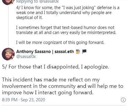 他后來解釋說,他并沒有完全參與這個組織,“考慮到聊天中有一些熟悉的名字”,他并不認為這是一個騙局,“因為在聊天中有熟悉的名字”。雖然他承認“我只是開個玩笑”的辯護不夠有力,但他堅持自己的主張,他絕不參與詐騙。他也是為數不多的公開道歉的有影響力的人之一。